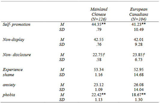 Hypothesis 2: Cultural differences are expected to emerge across the three facets of perfectionistic self-presentations, as well as in levels of shame, and social anxiety or social phobia. Specifically, individuals from Mainland China would be anticipated to report higher levels of perfectionistic self-promotion and greater experiences of shame than their Euro-Canadians. In contrast, Mainland Chinese participants would be expected to report lower levels of nondisplay and nondisclosure imperfections than European Canadians. This may be because European Canadians who strive to appear flawless and actively avoid revealing imperfections may experience greater psychological strain in challenging interpersonal situations, leading to heightened anxiety, fear, and avoidance behaviors. Moreover, shame is generally regarded as a maladaptive emotion in Western cultural contexts, whereas in Eastern cultures such as China, shame is often considered a more adaptive and socially regulating emotion. Consequently, these cultural distinctions are expected to contribute to systematic differences across perfectionistic self-presentation, shame, social anxiety and social phobia related outcomes.