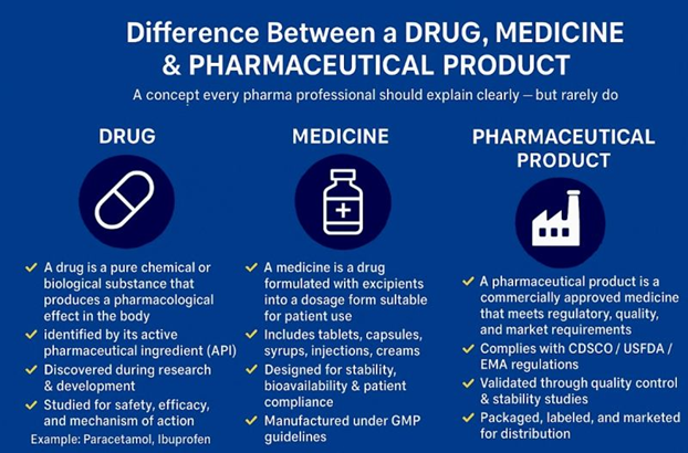 The terms drug, medicine, and pharmaceutical product are frequently used interchangeably in scientific literature, clinical practice, and regulatory discourse. However, these terms represent distinct concepts with important implications for drug development, regulation, clinical use, and public understanding. A drug refers to an active chemical or biological substance that produces a pharmacological effect in the body. In contrast, a medicine is a finished dosage form that contains one or more drugs formulated with excipients and approved for therapeutic use. The broader term pharmaceutical product encompasses drugs, medicines, diagnostic agents, vaccines, biologics, and other health-related products developed and manufactured under pharmaceutical standards. This review aims to clarify the conceptual and practical differences between drugs, medicines, and pharmaceutical products by synthesizing evidence from regulatory guidelines, pharmacological literature, and clinical studies. A narrative literature review was conducted using major biomedical databases, focusing on definitions, regulatory frameworks, formulation science, and clinical applications. Comparative analysis was applied to highlight differences in composition, regulatory approval, quality control, and therapeutic intent. The findings indicate that while drugs represent the pharmacologically active entities, medicines are patient-ready formulations designed to ensure safety, efficacy, and adherence. Pharmaceutical products extend beyond therapeutic agents to include preventive and diagnostic tools regulated under pharmaceutical legislation. Misuse of these terms may lead to regulatory confusion, prescribing errors, and misinterpretation of scientific data. In conclusion, precise differentiation between drugs, medicines, and pharmaceutical products is essential for accurate scientific communication, regulatory compliance, and effective clinical practice. Improved conceptual clarity can enhance interdisciplinary collaboration, education, and healthcare decision-making.