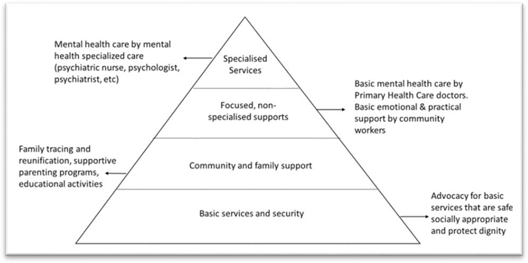 The delivery of MHPSS services to all level of victims involved in disasters in general and specifically during COVID-19 follows the principle that basic needs shall be provided to all victims, followed by restoration of community and family support and followed by focused and specialized services to a smaller subgroup among those affected by the crisis. Below explains the model of MHPSS role in each level of need.