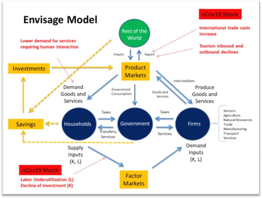 Figure 2: Implications of the COVID-19 as implemented in the Envisage model (Maliszewska, Mattoo and Van der Mensbrugghe, 2020).