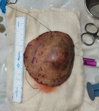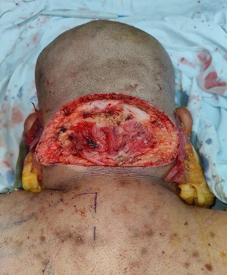 Figure 3: Figure showing reconstruction of the scalp defect with Trapezius myocutaneous flap.