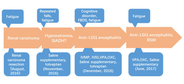 Conclusion: Anti-LGI1 encephalitis with renal carcinoma indicated its paralimbic pathology origin. The early diagnosis and immune-modulation therapy could lead to a good outcome. The hyponatremia in anti-LGI1 encephalitis was renal salt wasting instead of syndrome of inappropriate secretion of antidiuretic hormone.