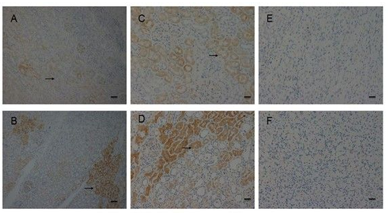 Figure 2: Expression of LGI1 by patient’s carcinoma. Tumor junction tissue sections of the patient’s renal clear cell carcinoma from a patient with serum LGI1 antibodies (A, C, E), another patient with only renal clear cell carcinoma without serum LGI1 antibodies (B, D, F). A commercial antibody against LGI1 (rabbit polyclonal anti-LGI1, abcam, ab137045, diluted 1:50) was used for IHC. Note the expression of LGI1 in normal renal tubule (C,D) and absent in carcinoma tissue (E,F), and the reduced expression pattern in the patient with LGI1 serum antibody (C,D), and higher expression in proximal than distal convoluted tubules (C,D). (The bar presented 20mm, 10mm, 10mm for A,C,E,respectively).
