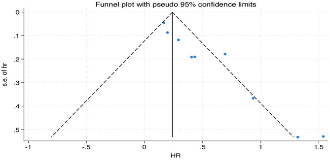 Analysis by study design (cohort vs. case-control) showed no significant differences between groups (Figure 4). The case-control subgroup demonstrated an effect size of HR = 0.23 (95% CI: 0.06 to 0.39) while cohort studies showed HR = 0.24 (95% CI: 0.1 to 0.32), indicating study design was not a major source of heterogeneity.