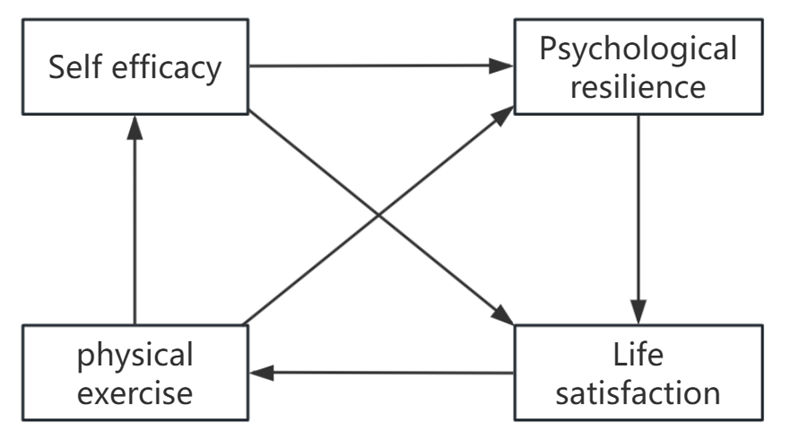 Physical exercise has attracted the attention of psychologists, and research has found that it not only directly affects life satisfaction was positively related to but also plays a protective role in life satisfaction through psychological resilience and mental health [6]. Study conducted by Gould and his colleagues reveals that athletic competition can predict perfectionism, which is identified as one of the personality traits among Olympic champions. Additionally, college athletes exhibit a higher tendency towards implicit perfectionism compared to their non-athlete counterparts, and they also significantly outperform the latter on the dimension of positive perfectionism [7]. You pointed out that college students' understanding of life and the world has not yet been fixed. Once they encounter setbacks in their studies, employment, love, and other aspects, they are prone to psychological crises. Strong self-regulation and recovery abilities are crucial for the psychological development of college students. Psychological resilience is a factor in overcoming adversity and adapting to development, providing protection and prevention for individual mental health issues. Appropriate intervention measures should be taken to improve the resilience of college students, especially their psychological resilience, such as strengthening mental health counseling and conducting regular psychological assessments related to sports [8]. Scholar Liu pointed out that self-efficacy is an intrinsic driving force of psychological resilience, and there is a certain correlation between the two [9]. Through a comprehensive analysis, this study selects four variables including physical exercise, life satisfaction, self-efficacy, and psychological resilience to discuss in depth the research on the relationship between physical exercise and life satisfaction, as well as its influencing mechanisms. Most studies have indicated that physical activity interventions can enhance individuals' subjective well-being [10]. Research by Netz [11] and Wicker et al. It has been shown that sports activities do not have a positive or even negative relationship with the subjective well-being of certain groups of people [12]. Additionally, Qu Hui's study revealed that college students with a tendency for exercise dependence may experience anxiety and depression when their exercise plans are hindered. Consequently, it can be seen that the relationship between physical exercise and well-being is somewhat complex, and its positive promoting effect may be diminished by other psychological variables [13]. Firstly, relationships among physical exercise, life satisfaction, psychological resilience, and self-efficacy among college students is investigated. Secondly, the study explores the impact possible mechanism of physical exercise on life satisfaction among college students, and verifies the mediating effects of self-efficacy and psychological resilience between physical exercise and life satisfaction among college students. By utilizing physical exercise to enhance self-efficacy and promote psychological resilience among college students, their level of life satisfaction can potentially can be elevated. The aim is to explore effective ways to improve college students' life satisfaction [14].