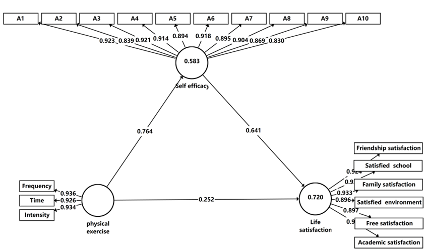 Recent studies have primarily focused on the impact of physical exercise on life satisfaction, with a particular emphasis on the effects of different sports activities on life satisfaction. There has been limited exploration of the underlying relationship between physical exercise and life satisfaction. Previous research has shown that self-efficacy and physical behaviors mutually predict and was positively related to life satisfaction and happiness, but the specific mechanisms are not yet clear. Understanding the internal mechanisms through which physical exercise affects life satisfaction is crucial for providing actionable pathways to enhance the levels of life satisfaction among different populations. Louth conducted a mixed methods study to investigate the Significant relationship of a physical activity intervention program on university students [33]. After a 6-month intervention involving sports games, students perceived self-efficacy in their physical abilities improved. The inclusivity and cooperation in sports activities were found to be crucial for student development. It is important for society to support the implementation of physical activities in schools to enhance self-efficacy and promote social-emotional well-being and happiness among young students. Clevinger highlighted the potential physical and psychological benefits for early adolescents participating in sports. Their study with sixth-grade students revealed a significant correlation between sports participation and cardiorespiratory fitness and self-efficacy [34]. High-quality sports experiences provided unique physical and psychological benefits for early adolescents. Knifed pointed out the common phenomenon of decreased happiness among students transitioning to college. Research results showed that high levels of campus activity intensity were significantly negatively correlated with feelings of loneliness and social anxiety, while positively correlated with a sense of belonging. This underscores the importance of students' participation in extracurricular sports activities [35]. Smith identified physical activity, emotional factors, and bedtime routines as unique predictive factors for life satisfaction among adolescents, significantly correlated with their happiness. There is a strong association between adolescents' physical activity and subjective well-being, with higher levels of physical activity leading to greater life satisfaction [36]. The Scholar Yan Shiji, based on the theory of self-efficacy, social exchange theory, and expectancy confirmation theory found that college students' exercise self-efficacy and life satisfaction play a chain-mediating role [37]. Scholars Li explored the mediating role of confidence and psychological resilience in high school students' extracurricular physical exercise and life satisfaction, proposing that extracurricular physical exercise directly affects life satisfaction, while confidence indirectly affects high school students' life satisfaction. In addition, through the chain mediation of self-confidence and psychological resilience, extracurricular physical exercise indirectly affects the life satisfaction of high school students [38]. In summary, recent research has mainly focused on the relationship between physical exercise behavior and life happiness, mainly exploring the research of various sports activities on life happiness. There has been limited exploration into the intrinsic relationship between physical exercise and life satisfaction. Previous studies have indicated that self-efficacy and physical activity can predict each other and was positive related to life satisfaction and happiness, yet the specific processes involved remain unclear. Only by elucidating the internal mechanisms through which physical exercise influences life satisfaction can we provide actionable pathways to enhance the life satisfaction levels of different populations.