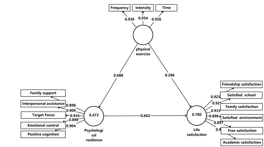 Method: A sample of participants who engaged in regular physical exercise was recruited for data collection. Structural equation modeling was employed to analyze the hypothesized mediation model, including: Direct path: Physical exercise → Life satisfaction. Indirect paths: Physical exercise → Self-efficacy → Psychological resilience → Life satisfaction.