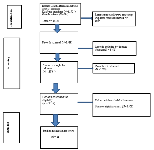 Initially, 13485 articles were retrieved: 11830 from PubMed, 987 from Scopus, 123 Google Scholar, 421 web of science and 124 Cochrane Library databases. Eight thousand and five hundred eighty-nine remained after removing duplicates and using automation tools. 5798 articles were screened based on their title and abstracts and removed. Then 1512 articles were screened by using the eligibility criteria. Finally, 11 articles met the eligibility criteria and were included in the analysis (Figure 1).