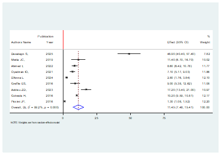 In this study two outcomes were extracted namely mortality and development of complication. Eleven studies reported death as the treatment outcome with a total participant of 26, 0492 and nine studies reported development of complication with a total participant of 22450. The pooled proportion of complication was found to be 11.45% (95% CI: 7.48-15.4) with a heterogeneity index of 99.2%, with a P-value of less than 0.001(Figure 2). The pooled proportion of mortality was found to be 16.7% (95% CI: 10.9-22.6) with a heterogeneity index of 99.8%, with a P-value of less than 0.001(Figure 3).