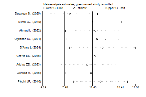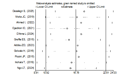 Figure 9: Sensitivity analysis of pooled global prevalence of mortality among patients with atrial fibrillation for each study being removed one at a time.