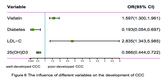 0.1 were included in the logistic regression equation as independent variables. Stepwise regression was used for multivariate analysis. The serum 25-(OH)D3, visfatin, and LDL-C levels and diabetes were independent risk factors for poor CCC development (Figure 6).