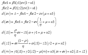 The variables sv, ev, z1, z2, rv represent susceptible, exposed, acutely infected, chronically infected, and recovered populations. The control and bifurcation parameters u1, u2, and u3 represent the isolation of infected individuals, the treatment of infected