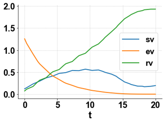 When u2 was the bifurcation parameter, a branch point was found at (sv, ev, z1, z2, rv, u2) values of (2.760906, 0, 0, 0, 0, 0.114105)(Figure. 1b). When u3 was the bifurcation parameter, a branch point was found at (sv, ev, z1, z2, rv, u3) values of (1.585122, 0, 0, 0, 1.175784, 0.026867) (Figure. 1c). These results indicate that the introduction of control parameters cause branch point bifurcations to appear.