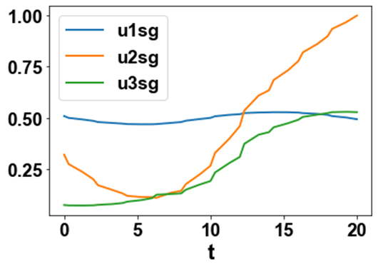 subject to the equations governing the model. This led to a value of zero (the Utopia point). The MNLMPC values of the control variables, u1, u2, and u3 were 0.4992, 0.32099, and 0.06119. The MNLMPC profiles are shown in Figures 2a-2d. The control profiles of u1, u2, and u3 exhibited noise (Fig. 2c) and this was remedied using the Savitzky-Golay filter to produce the smooth profiles u1sg, u2sg, and u3sg (Figure. 2d). The presence of the branch points causes the MNLMPC calculations to attain the Utopia solution, validating the analysis of Sridhar (2024) [20].