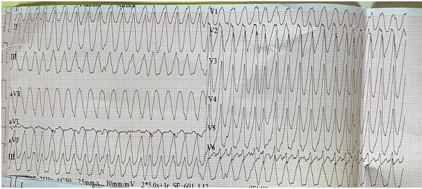 The patient's symptoms began about six hours prior to admission, with a sudden onset of intense palpitations, profuse sweating, and vomiting. On arrival, he was tachycardic at 220 bpm, showing clear signs of poorly tolerated sustained ventricular tachycardia (figure 1).