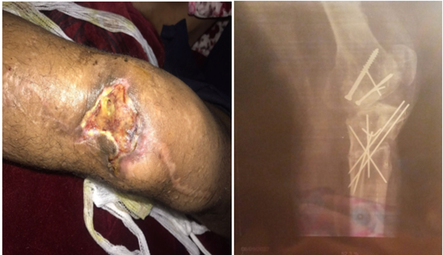 Figure 4: the wound of the left knee and the x-ray shows the material of the latest surgery
