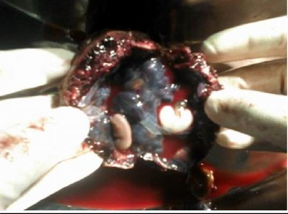 In view of the Twin live ectopic pregnancy she was immediately operated. Intraoperatively, the ampullary part of the right fallopian tube was found showed a sac like structure. A right salphingotomy was done. She was discharged on the 7 th day. On cut section of the sac there was evidence of two embryos Pathological evaluation of the surgical specimen showed a diamniotic monochorionic twin’s pregnancy within the fallopian tube and measurement of the twin feti estimated their gestational age at 7 weeks.