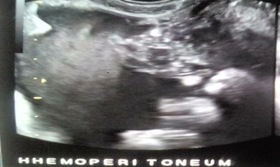 Figure 4: Trans vaginal Sonography shows both adnexae heterogeneous mass with two irregular sacs and hemoperitoneum. Both ovaries are visualised