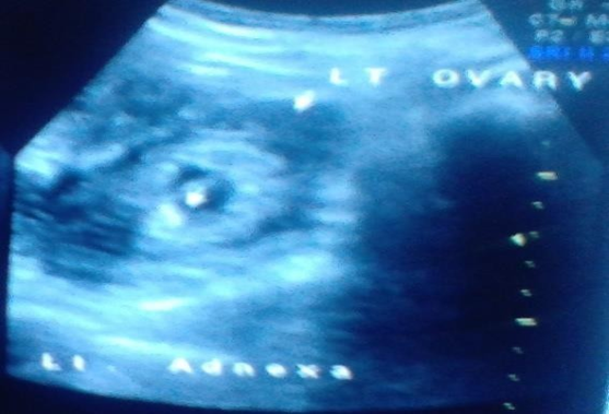 Figure 3: Trans vaginal Sonography shows Right adnexa heterogenous mass with two irregular sacs and hemoperitoneum. Left ovary is visualised