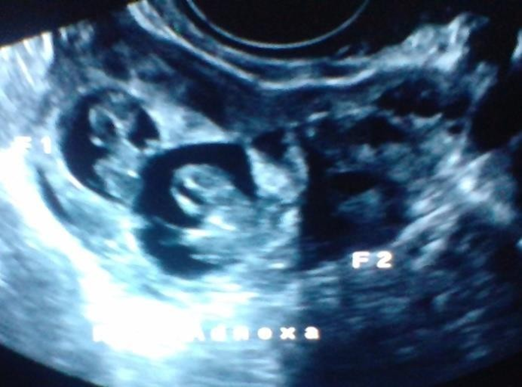 Figure1:Shows Right adnexal sac with Twin live ectopic gestation of approximately 7wks 5 days .No intrauterine pregnancy .Both ovaries are separately visualised.