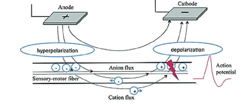 current through a pair of electrodes positioned on the skin above sensory-motor structures. The electric field created between the two electrodes (anode and cathode) induces an ion flux in the tissue (Figure 6). Specifically, the anode, functioning as the positive electrode, imparts a positive charge to the cell membranes of neighboring neurons, resulting in an accumulation of negative ions and subsequent membrane hyperpolarization. In contrast, the cathode, serving as the negative electrode, attracts positive ions, leading to depolarization in the underlying membrane region. If the depolarization reaches a critical threshold, an action potential is generated, indistinguishable from a physiological one. This generated action potential propagates to the neuromuscular junction, causing muscle fibers to contract. It is essential to note that the charge threshold required for generating action potentials in muscle fibers is significantly higher than that for neurons. As a result, electrical stimulation predominantly activates nerves rather than muscles, underscoring the importance of intact lower motor neurons for the effectiveness of Functional Electrical Stimulation (FES) [18,28].