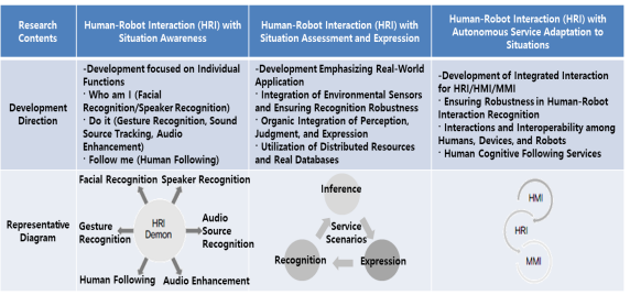 In the future, it is anticipated that the development of recognition technology will transition from unit-function-based continuous monitoring to recognition technology integrating environmental sensors and distributed resources. Following recognition, there will be an organic integration of perception, judgment, and expression based on service scenarios to provide services. Moreover, HRI technology is expected to evolve into an open and market-oriented form, where market participants and technology providers share information and knowledge. This will enhance responsiveness to actual services through efficient utilization of computing resources. Robot services will take on a form where knowledge and resources are shared, reused, and virtualized, similar to the web. In this manner, robots and avatars can interact in virtual spaces, providing a core technology applicable across various fields such as education, healthcare, entertainment, and social safety, where humans and spaces are shared.