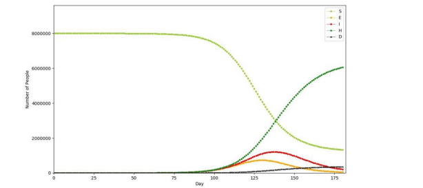 The model used here is the SEIHD model, which is the equivalent of the SEIR model. Because (H) and (D) here represent the number of people cured and the number of people who died from the disease, respectively, adding these two together gives (R). To study infectious diseases for the long-term effects on society, we set the number of simulation days to 180, which is about six months.
