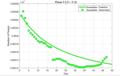 Figure 9: Result of curve fitting for the susceptible S(t) in Phase 3 (2020.3.31-2020.5.16)