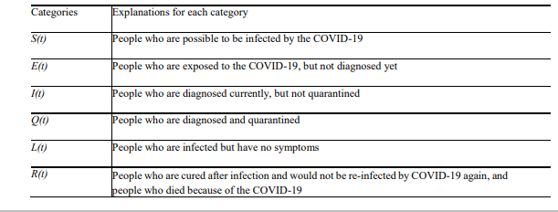 For the SEIQLR model, we set specific definitions for the six categories of people as shown in Table 1 below.