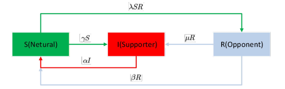 We can see from Figure 12 that the conversion relationship between neutrals, opponents and supporters can also be described by the SIR model, but there are some differences from the SIR model of infectious diseases. For instance, a neutral person (S) can directly become an opponent (R), but in an infectious disease, a susceptible person (S) must be transformed from an infected person (I) to a removal (R).
