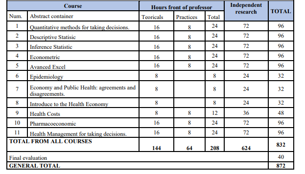 The diploma course “Health Economy tools for taking decisions” is agreed with the constant need of capacitating from the health managers. This course focus the attention in several quantitative tools applied to the health economy for take decision in the health management process. The table container all courses is the following [13, 14].