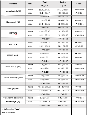 The comparison of the mean indicators of IDA before the intervention between the test and control groups with the independent t-test did not show any significant difference(P>0.05), and the two groups were the same. However, the comparison of the mean indicators of iron deficiency anemia, except for Hb, HCT, and MCHC, after the intervention in the test and control groups showed a significant difference(P≤0.05).