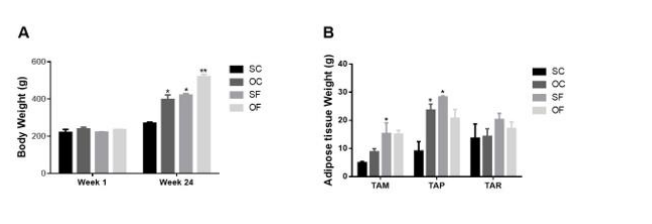 The figure 2 shows fat cell morphology after 24 weeks of diet. Control diet animals had uniformly sized adipocytes across all deposits. However, ovariectomized rats on a high-fat diet (OF) exhibited hypertrophic adipocytes in parametrial and mesenteric tissues without increased vasculature, while retroperitoneal tissue showed no significant changes.
