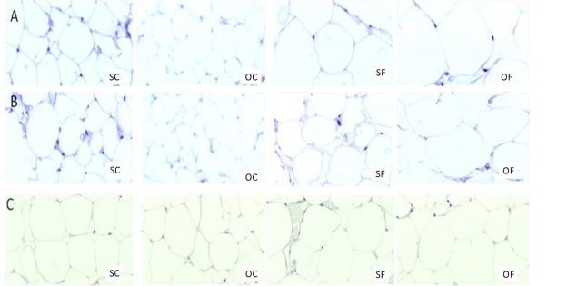 Figure 2: Micrograph of adipose tissue sections from the mesenteric (A), parametrial (B) and retroperitoneal (C) depots of SC, OC, SF and OF rats. Adipose tissue sections from different areas of all deposits were fixed and stained with hematoxylin and eosin. Micrographs were taken at 10x magnitude. Representative sections of each deposit are shown. Micrographs of the parametrial and mesenteric adipose tissue depots of OF rats show hypertrophic adipocytes without evidence of an increase in tissue vasculature. Retroperitoneal adipose tissue does not show any significant changes between groups.
