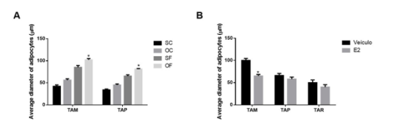Figure 3: Diameter of adipocytes from the mesenteric (TAM) and parametrial (TAP) adipose tissues of ovariectomized wistar rats fed for 24 weeks with a high-fat diet. * p<0>