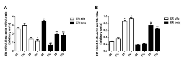 PCR was performed to amplify the c-DNA for ER-α and ER-β. To amplify ER-α, the following primers were used: sense primer with sequence TAAGAACCGGAGGAACAGTTG, and antisense primer with sequence TCATGCGGAATCGACTTG (product with 623 base pairs); To amplify ER-β, the following were used: sense primer with sequence GCTCCTCTATGCAGAACCTCAAA, and antisense primer with sequence CAGAAGTGAGCATCCCTCTTTG (product with 159 base pairs). PCR was performed using 20µl of MIX solution containing 2.2µl of specific buffer, 1µl dNTP (4mM), 0.2µl of each primer, 1µl of cDNA, 0.1µl of Taq polymerase and 15.30µl of water. The reaction products were analyzed by electrophoresis on a 1.5% agarose gel. The gel was developed with ethidium bromide (1µg/ml), visualized under ultraviolet light and digitalized. The bands were quantified using the ImageQuant 5 program. β-Actin was amplified as an internal control for each PCR using previously described specific primers. The results refer to three PCRs for each sample [16].