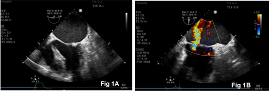 Figure 1: Intraoperative transesophageal echocardiography images showing mitral stenosis (Fig. 1A) and mitral regurgitation (Fig. 1B).