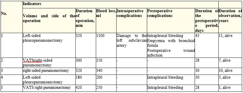 In 2 (40.0%) cases, the patient underwent pleuropulmonectomy in the clinic. In 3 cases, pneumonectomy (60%), and in 2 cases, the operation was performed video-assisted. The average duration of the operation was 308 min, and the average intraoperative blood loss was 408.0 ml. During the operation, we performed multiple sanitation of the pleural cavity with a solution of decasan to prevent pleural empyema.