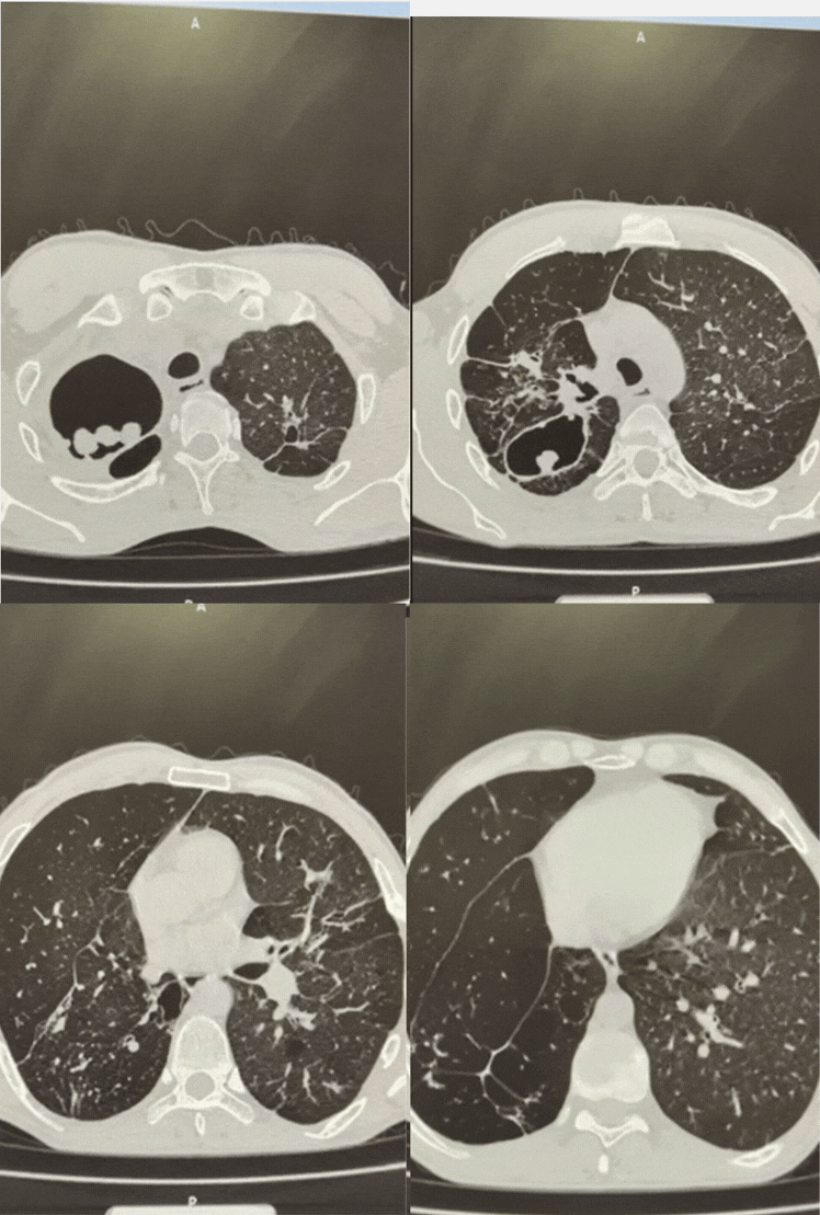 The main methods for diagnosing aspergillosis are: high-resolution computed tomography (CT) of the chest cavity, serological diagnostics - detection of galactomannan antigen in bronchoalveolar lavage, blood serum or biopsy material; microscopy and culture of sputum or biopsy material [4, 5, 7, 8]. In our country, due to the significant prevalence of tuberculosis, Aspergillus fumigatus quite often colonizes tuberculous decay cavities, which leads to the formation of aspergilloma. Aspergilloma can also form in bronchiectasis of non-tuberculous etiology, chronic abscesses, cysts, bullae, in a tumor node with decay [5, 7, 10-12]. On computed tomography scans, aspergilloma has the appearance of a rounded ball inside the cavity. Since its bulk is usually separated from the contours of the cavity by an air space, the so-called “air crescent” symptom is formed [ 4, 5, 6, 7, 13].