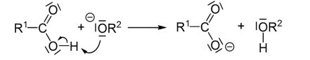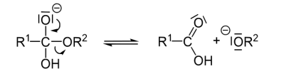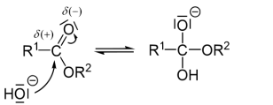 The mechanism by which esters are cleaved by base involves a series of equilibria. The hydroxide anion adds to (or "attacks") the carbonyl group of the ester [43]. The immediate product is called an orthoester: