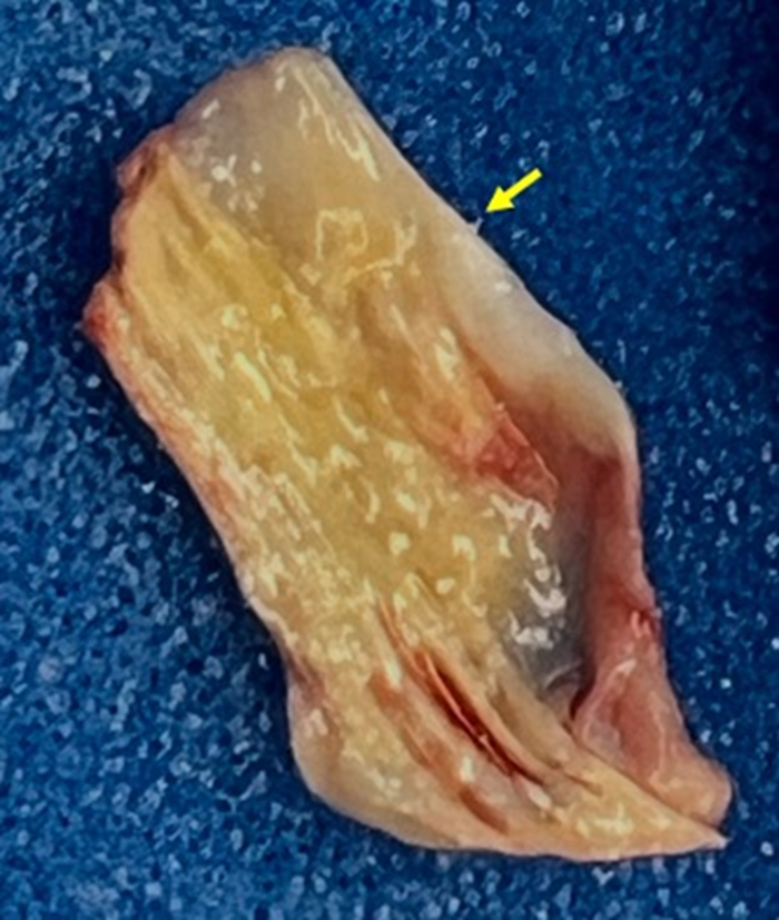 On the current presentation, the patient underwent repeat transthoracic echocardiography with bubble study and contrast-enhanced transthoracic echocardiography, neither of which demonstrated an intracardiac shunt or left ventricular thrombus. Electrocardiographically (ECG) synchronized cardiac computed tomography angiography (cCTA) was then performed as the final diagnostic test, supported by recent evidence demonstrating a higher diagnostic yield than echocardiography in the evaluation of acute stroke (Rinkel et al., 2022). cCTA revealed a 2-mm low-density tissue excrescence arising from the noncoronary cusp of the aortic valve (Figure 1) and simultaneously confirmed the absence of intracardiac thrombus or patent foramen ovale. Guided by cCTA localization, a repeat TEE with three-dimensional (3D) multiplanar reconstruction (Figure 2) successfully visualized the lesion. Intraoperative four-dimensional (4D) TEE with CT fusion—an innovative multimodality integration not previously described for this indication—was subsequently used for precise leaflet localization (Figures 3 and 4). Surgical pathology (Figure 5) demonstrated fibrocalcific degenerative changes of the noncoronary cusp and a small papillary fibroelastoma (PFE), which was deemed the most likely source of the patient’s recurrent cerebrovascular events.