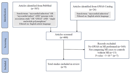 Studies were included in this systematic review when 1] a GWAS of MI was performed, defined as a GWAS comparing MI cases to controls without MI, and 2] the identified SNPs were genome-wide significant (p < 5>