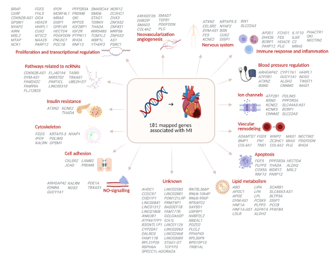 GWAS have identified MI-associated loci spanning both coding and non-coding regions, underscoring how variants in sequences encoding for proteins and regulating gene expression collectively shape MI susceptibility. The genes mapped to these variants are shown in Supplementary Tables 2 and 3.