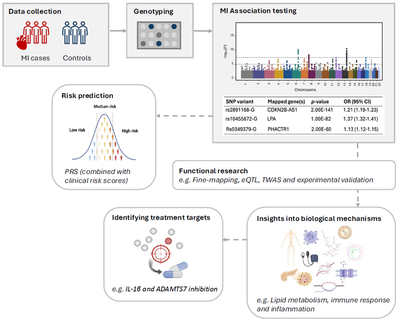 Figure 1: Overview of GWAS on MI workflow and its clinical implications
