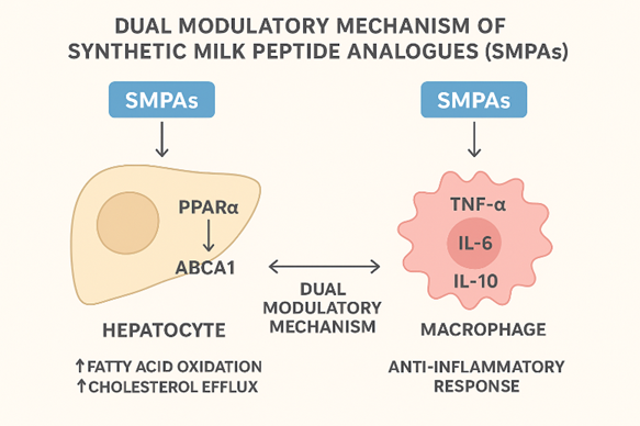 The schematic illustrates the proposed dual mechanism of synthetic milk peptide analogues (SMPAs). In hepatocytes, SMPAs activate PPARα and upregulate ABCA1, leading to enhanced fatty acid oxidation and cholesterol efflux. In macrophages, SMPAs suppress TNF-α and IL-6 while elevating IL-10, promoting an anti-inflammatory response. Together, these mechanisms contribute to the restoration of lipid and immune homeostasis