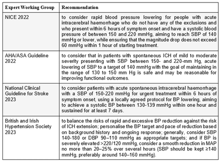 Table 1: Recommendations for BP reduction in acute ICH