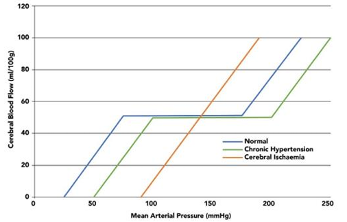 Schematic cerebral auto regulatory curve showing the relation between cerebral blood flow and mean arterial pressure. This is shifted to the right in chronic hypertension. Cerebral blood flow becomes pressure dependent for a time after acute stroke.[21]