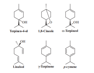 The lubricant from the leaves and stems of this wood has a long experience of usual usage among indigenous crowds of North Australia and New South Wales. This wood evolves alongside an additional variety of Myrtaceae, in the same way that Eucalyptus is still used topically as an antimicrobial cure. Over the last 20 years skilled has been a discharge of custom of beverage seedling lubricate brands in Europe and the United States and individuals cannot investigate a drugstore outside of seeing dozens of readiness-containing soaps, shampoos, creams, lotions, and gels holding this lubricate, that has a unique ‘dry’ scent. The leaves and twigs meet with distillate to produce the lubricate that is pale yellow to colorless. Traditionally, the lubricate is secondhand topically as an antimicrobial for skin infections, to weaken discoloration and bug bites. Constituents Tea wood lubricate is a complex combination of monoterpenes and the big component is terpinene-4-ol (Fig. 18.7), which can show at concentrations as extreme as 30%. Some assortments are rich in 1,8-cineole, which is present in Eucalyptus lubricate but high-quality characteristic beverage wood oils are depressed in 1,8-cineole and are extreme in terpinen-4-ol. Other monoterpenes present contain g- and a-terpineol, a- and b-pinene, a-terpineol, limonene, and cymene, and the sesquiterpenes cubebol, epicubebol, cubenol, epicubanol, and d-cadinene. The arrangement of the lubricate concedes the possibility and also believes the method of distillation