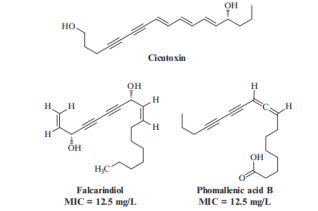 The flavonoids are presumably the ultimate intensively intentional organic amount in terms of them antimicrobial action and the flavanones, for instance, compound 1 (Fig. 18.12), inside this class have some very appealing levels of effectiveness and operation. Many of these unrefined amounts acquire prenyl or geranyl groups that reasonably donate to the lipophilicity and sheet solubility of these compounds. This manages to boost their cellular rudeness and reinforce their talent to pierce the bacterial container. Compound 1 has wonderful potency toward MRSA strains accompanying MIC principles of 1.5 mg/l and compound 2 is Sophora flavanone G, which is completely clean in allure own right (MIC ¼ 3.1 mg/l) and likewise has forceful the collaboration together, accompanying the glycopeptide medicine, vancomycin, that is secondhand clinically to treat MRSA contaminations (Sakagami and others, 1998). A mixture of Sophora flavanone G and Vancomycin could influence the situation of MRSA contamination and it is reasonable that these lipophilic compounds may be planned into a current antiseptic readiness to help accompany decolonization. Plants inside the Apiaceae offspring, which involves reward, coriander, parsnip, caraway, and dill are popular for producing polyacetylene instinctive products. These compounds have conjugated three-fold bonds (acetylenes). Some of these metabolites are malignant and harmful, to a degree, cicutoxin from Cow bane (Cicuta virosa), when in fact remainder of something in the way that falcarinol (Figure. 18.13) are present in the ancestries of these plants and are presumably combined as a care against bacteria in their atmosphere. Falcarindiol has a related shape to phomallenic acid B, a fungal-derivative completely clean natural produce that has proven the expected prevention of greasy acid synthase-2 (FAS-II) and it is attainable that falcarinol functions analogously. Falcarindiol is present in many Chinese curative plants, and one individual of these, Angelica dahurica is used to treat blemishes this meta-polite grant permission to incompletely arrange this operation as the main bacterial creative agents of blemishes are the staphylococci and Propionibacterium acnes