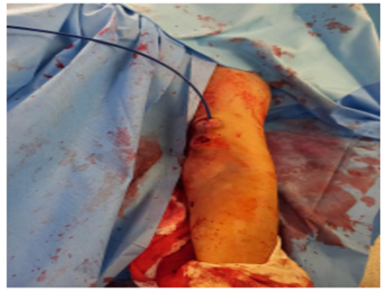 Figure 1: Intraoperative image showing brachial-basilic arteriovenous fistula and a Viabahn occlusion